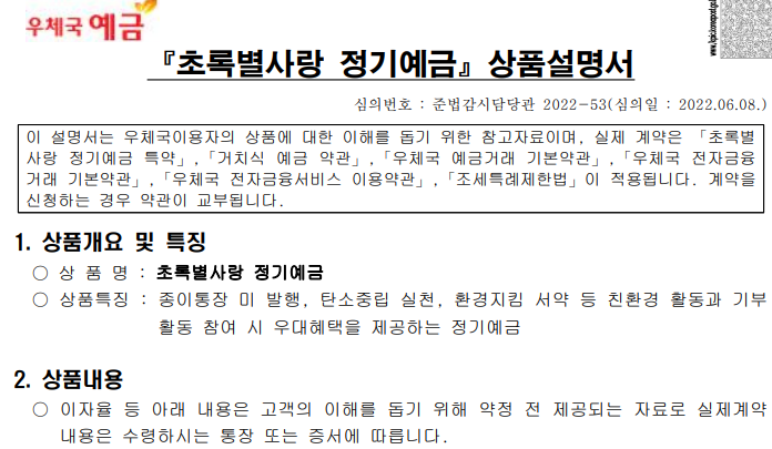 우체국 초록별사랑 정기예금 상품설명서는 아래 링크 참고하세요