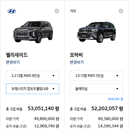 현대자동차 공식홈페이지 팰리세이드 가격표 보기