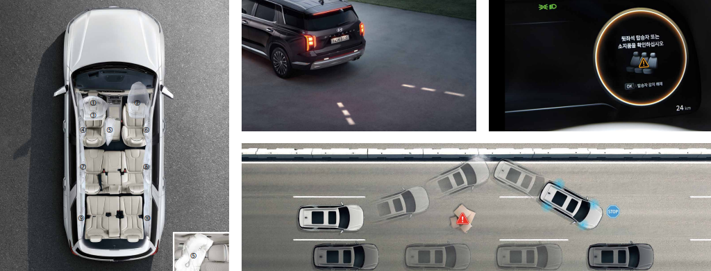 10에어백 시스템(앞좌석 어드밴스드 에어백, 앞좌석 사이드, 2열 사이드, 커튼, 운전석 무릎, 앞좌석 센터사이드, 전복감지센서 포함), 유아용 시트 고정장치(2열 2개/3열 1개), 구동선회 제어기능, 다중 충돌방지 자동 제동 시스템