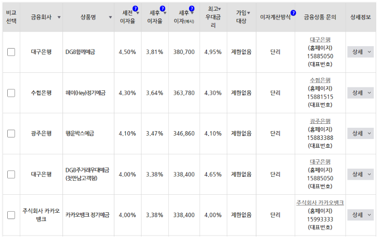 은행연합회에서 제공하는 자료를 보면 1년 만기 정기예금 중 가장 높은 금리를 제공하는 상품은 DGB대구은행의 DGB함께 예금인데 이 상품역시 5%가 안되는 연 4.75% 금리를 제공하고 있습니다. 대구은행 상품외에는 SH수협은행이나 인터넷뱅크 케이뱅크나 카카오뱅크가 그나마 높은 금리를 제공하고 있습니다.
